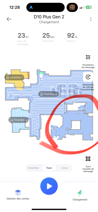 【D10 Plus Gen 2】Bonjour J’ai acheté un dream D10 gen 2 Il fonctionne mais ne va pas dans une zone (le tapis du salon sur lequel il passe sans soucis quand je le contrôle manuellement avec la télécommande de l...voir tout
